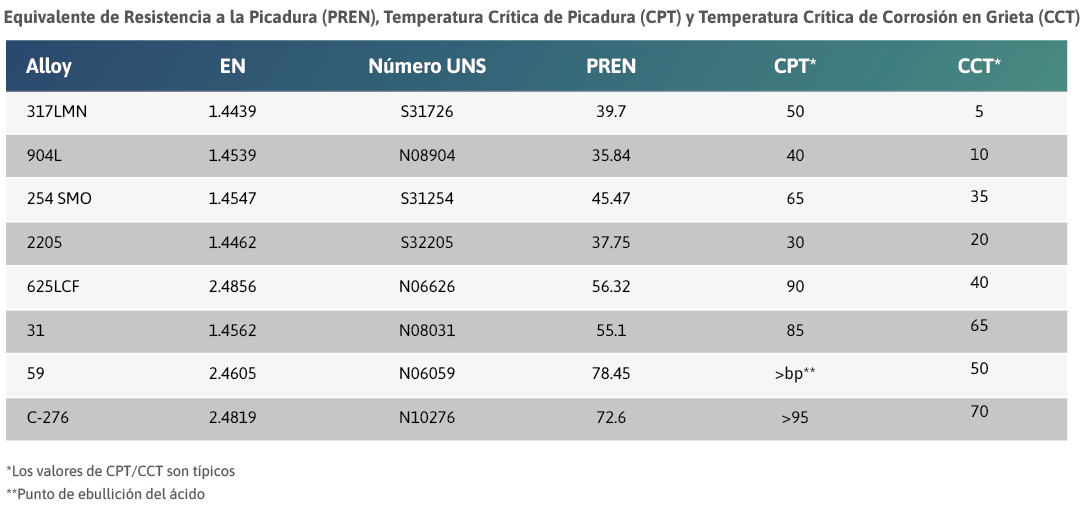 En la tabla se pueden observar valores útiles de las aleaciones. Recordemos que a mayor PREN mayor resistencia a la corrosión.